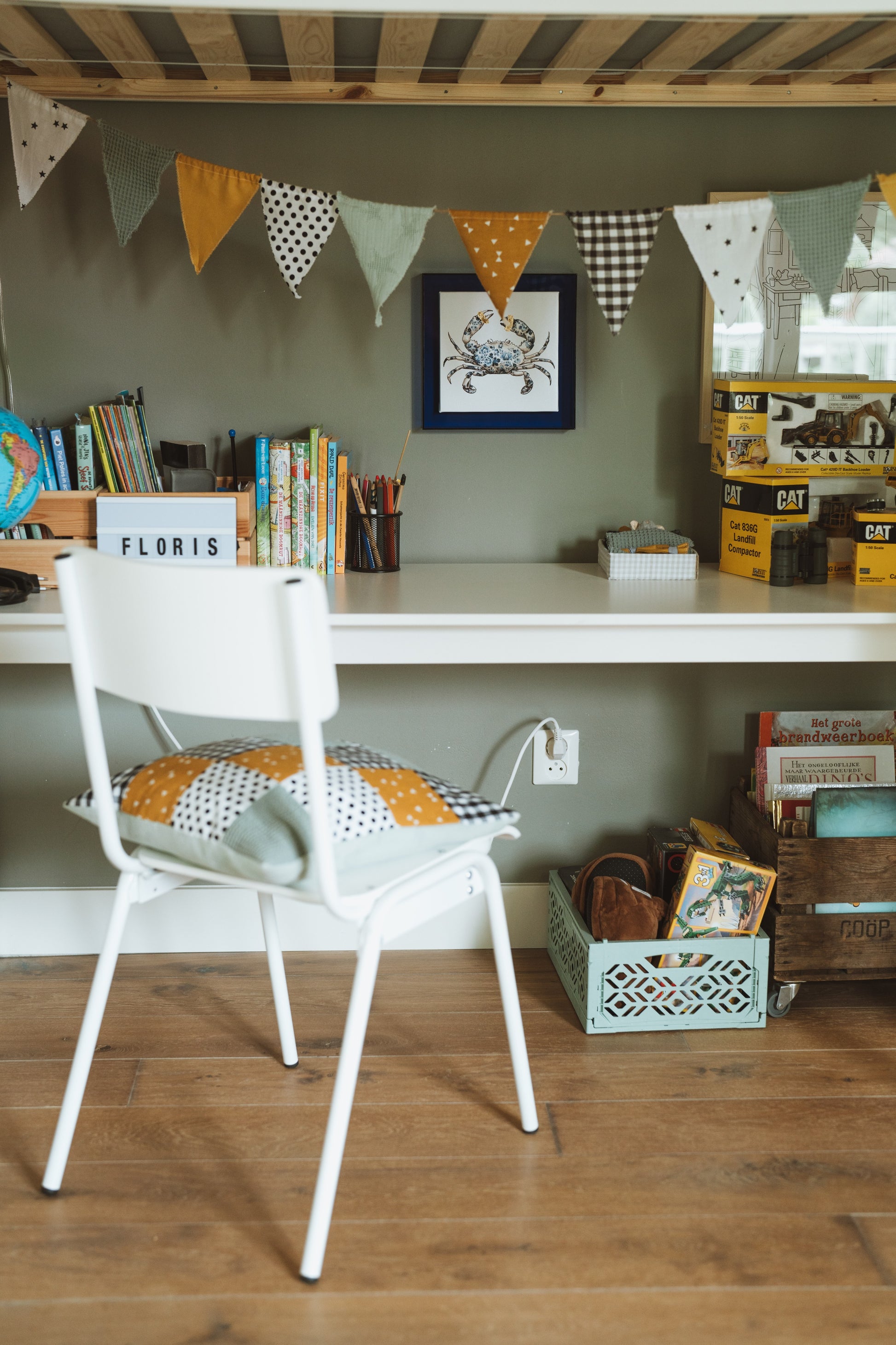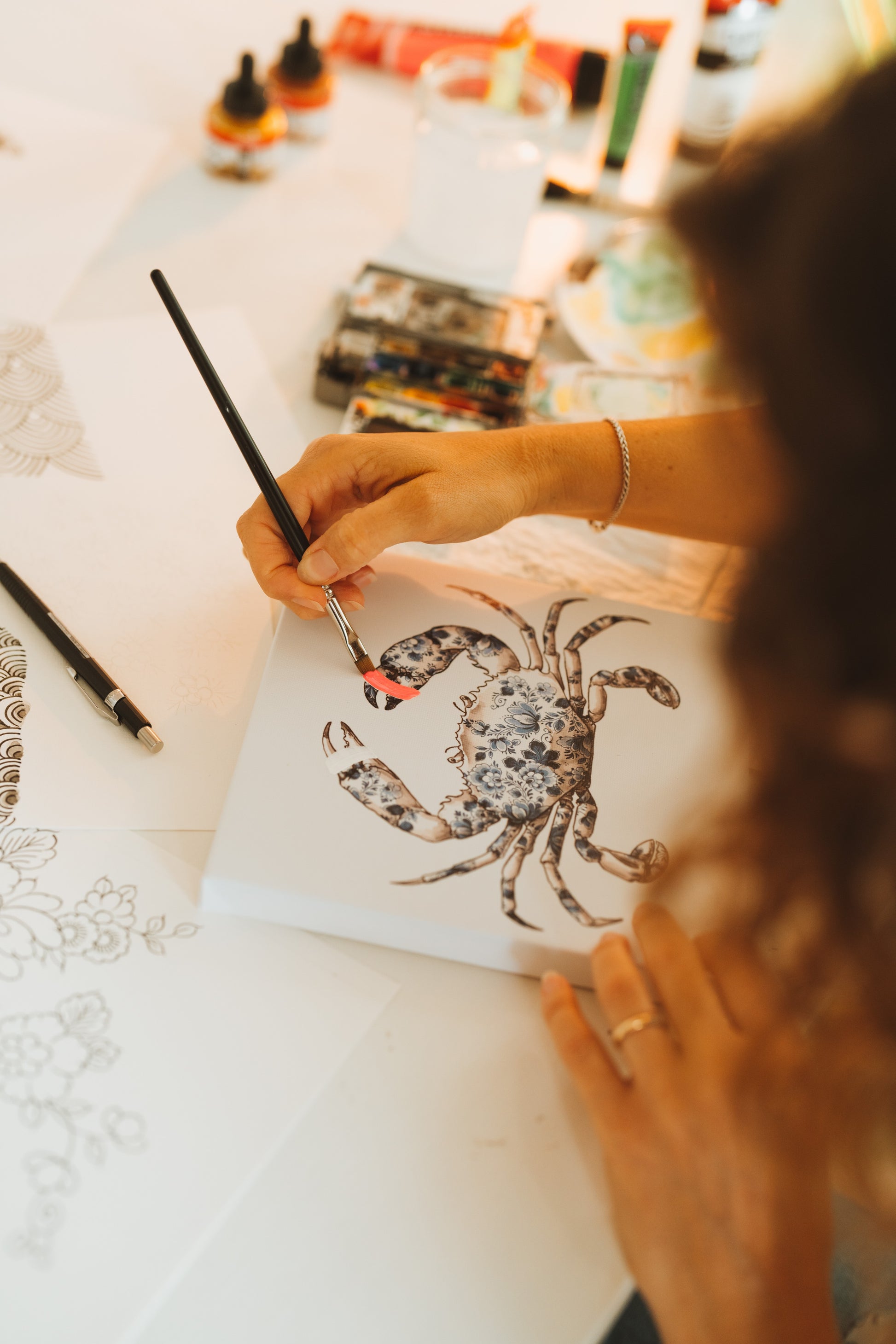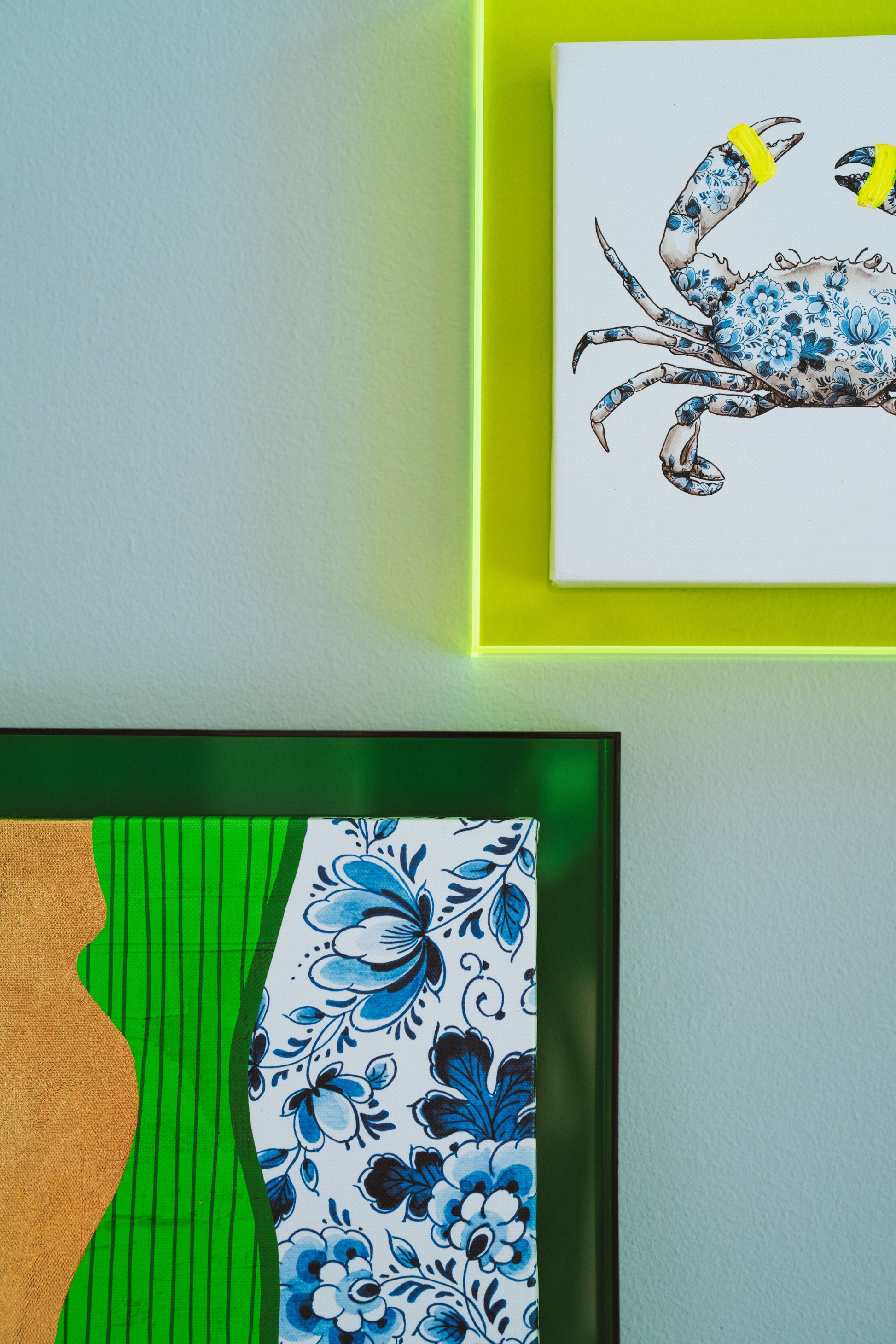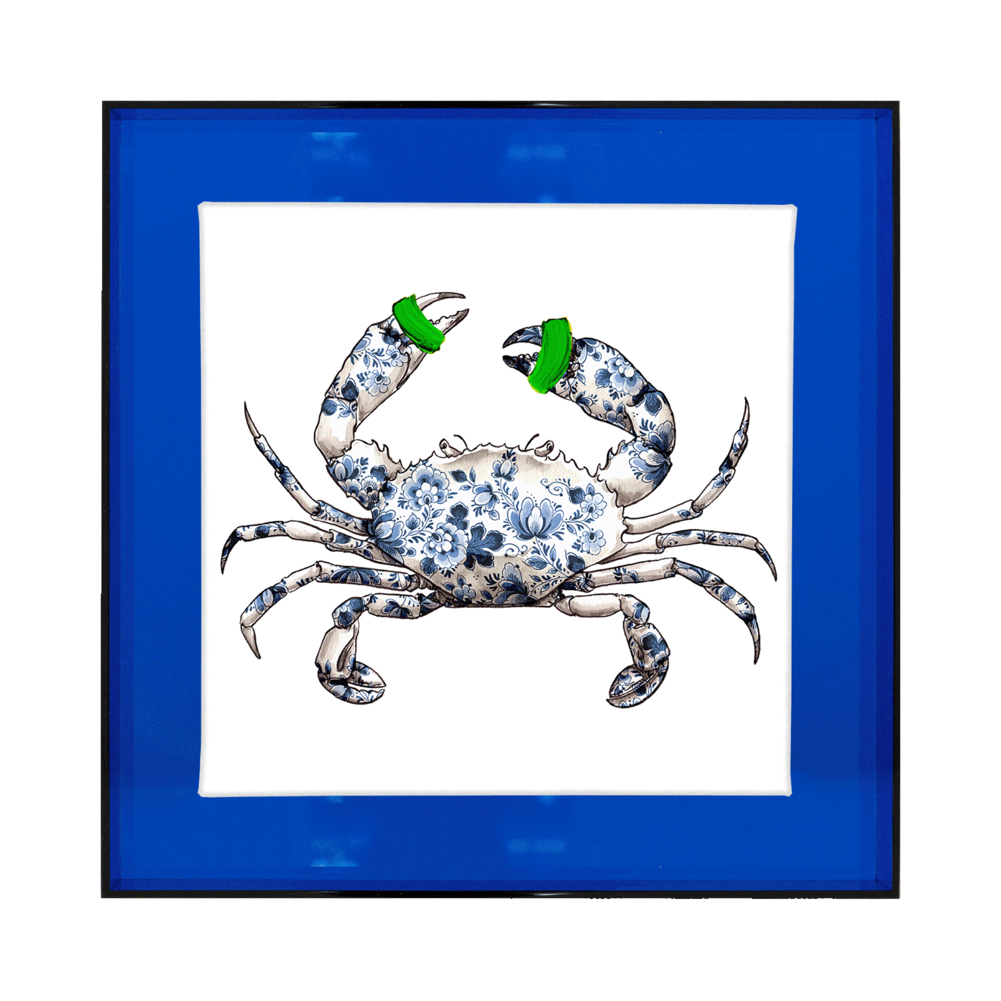 Fleur je huis op met dit prachtige schilderijtje met een afbeelding van een krab. De krab is eerst geschilderd door Wilma en daarna met een Delfts blauw patroon ingevuld. Een spannend detail maakt deze klassieke schildering helemaal hip.